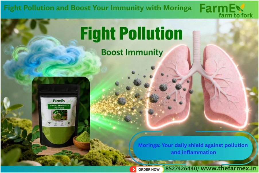 Moringa acts as a natural shield against these pollution-related issues. Its chlorophyll helps detoxify the body by flushing out pollutants and heavy metals, while antioxidants like Vitamin C and Quercetin support lung health and reduce respiratory inflammation.